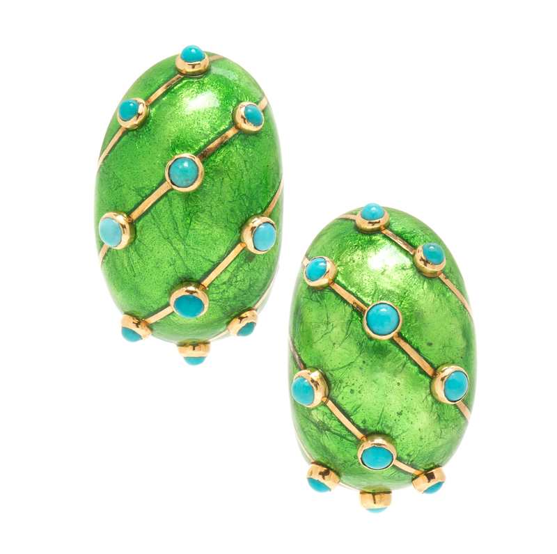 A Pair of 18 Karat Yellow Gold, Paillonn Enamel and Turquoise Earclips, Schlumberger for Tiffany & Co., French,