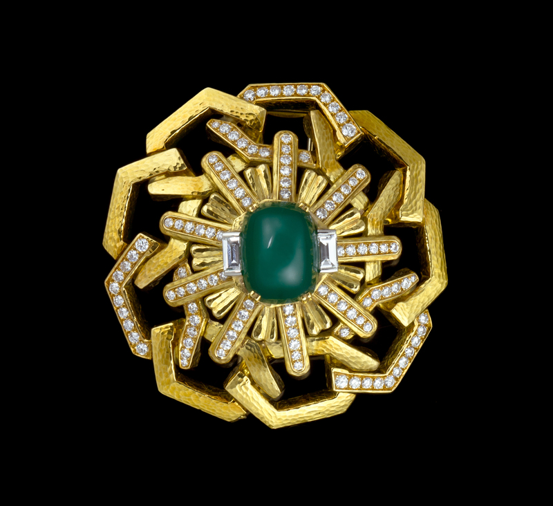 in a geometric knot link motif with hammered finish, containing one cushion shape cabochon cut dyed green chalcedony measuring approximately 19.74 x 14.90 mm, flanked by two baguette cut diamonds weighing approximately 1.16 carats total and 106 round brilliant cut diamonds weighing approximately 2.88 carats total, brooch measures approximately 70.00 x 68.00 mm.Stamp: David Webb 18K.Accompanied by a black case signed DAVID WEBB.