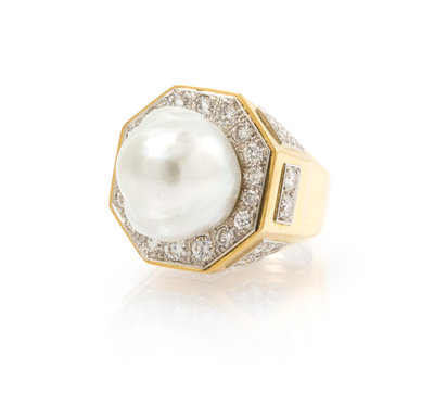 An 18 Karat Yellow Gold, Platinum, Cultured Pearl and Diamond Ring, David Webb,