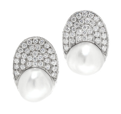 containing two baroque pearls measuring approximately 16.50 x 15.50 mm and 200 round brilliant cut diamonds weighing approximately 6.00 carats total, hinged collapsible posts.