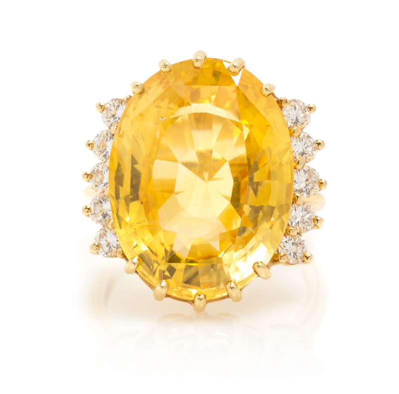 containing one oval mixed cut yellow sapphire weighing approximately 32.67 carats and 10 round brilliant cut diamonds weighing approximately 0.80 carat total.NOTE: The stone has a known weight of 32.67 carats.Accompanied by an American Gemological Laboratories sapphire identification and origin certificate number CS 62247, dated July 10, 2014, stating Mineral Type: Natural Corundum, Variety: Yellow Sapphire, Origin: Ceylon (Sri Lanka), Enhancement: No gemological evidence of heat, Clarity Enhancement: None.