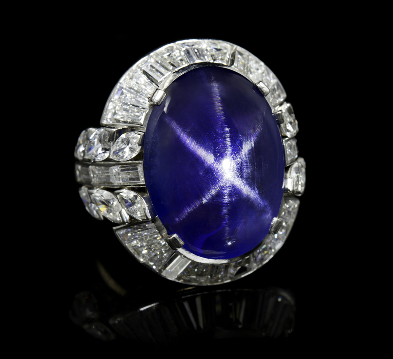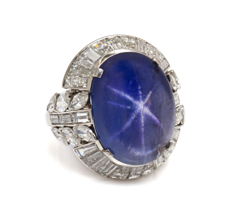 containing one oval cabochon cut star sapphire measuring approximately 20.58 x 15.45 x 8.58 mm within a surround of numerous marquise and baguette cut diamonds weighing approximately 4.75 carats total weight.Accompanied by an American Gemological Laboratories sapphire identification and origin certificate number CS 61988, dated July 15, 2014, stating Mineral Type: Natural Corundum, Variety: Star Sapphire, Strength of Star: Prominent, Quality of Star: Excellent, Origin: Burma (Myanmar), Enhancement: No gemological evidence of heat, Clarity Enhancement: None.