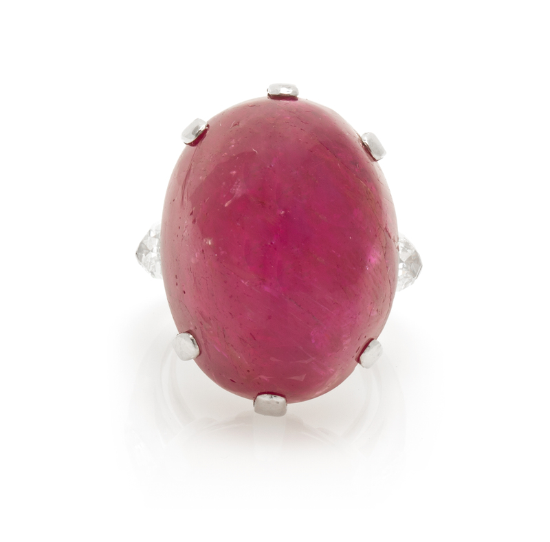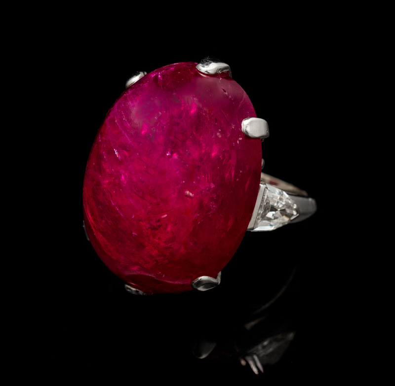 containing one oval cabochon cut ruby measuring approximately 26.18 x 20.38 x 16.46 mm and two shield shape step cut diamonds weighing approximately 0.68 carat total.Accompanied by an American Gemological Laboratories ruby identification and origin certificate number CS 61375, dated May 28, 2014, stating Mineral Type: Natural Corundum, Variety: Ruby, Origin: Burma (Myanmar), Enhancement: None, Clarity Enhancement: None.