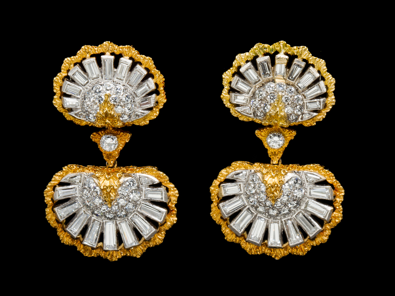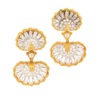 in a dangle design consisting of two opposed openwork white gold fan form sections bordered by and joined with intricately engraved yellow gold borders and hinges in a foliate motif, containing 36 baguette cut diamonds weighing approximately 3.00 carats total, eight triangular step cut diamonds weighing approximately 0.28 carat total and 58 collet and pave set round brilliant cut diamonds weighing approximately 1.32 carats total.Hand inscribed: BUCCELLATI 18K ITALY.Stamp: 750 (Italian maker's mark 763 MI).Accompanied by a case signed BUCCELLATI.