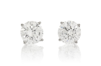 consisting of two round brilliant cut diamonds weighing approximately 3.16 carats total.Stamp: 14K.Accompanied by a copy of a Gemological Institute of America diamond grading certificate number 11109032, dated June 1, 2000, stating Weight: 1.56 carats, Color: D, Clarity: SI1, Table: 57.00%, Depth: 62.50%, Polish: Very Good, Symmetry: Very Good, Fluorescence: Strong Blue.Accompanied by a copy of a Professional Gem Sciences diamond grading certificate number 2506030741, dated July 31, 2014, stating Weight: 1.60 carats, Color: D, Clarity: SI1, Cut: Premium Cut, Table: 60.00%, Depth: 62.80%, Polish: Good to Very Good, Symmetry: Good to Very Good, Fluorescence: Strong Blue.