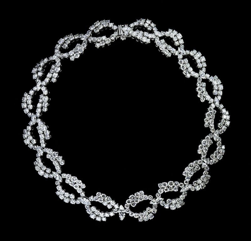 consisting of interlocking opposed C shape links containing 343 round brilliant cut diamonds weighing approximately 55.00 carats total punctuated with joints containing 17 marquise cut diamonds weighing approximately 8.05 carats total, central hidden hinged suspension loop.Accompanied by a blue case signed BOUCHERON PARIS, 26 Place Vendome NEW YORK, 610 Fifth Avenue 180 New Bond Street LONDON.