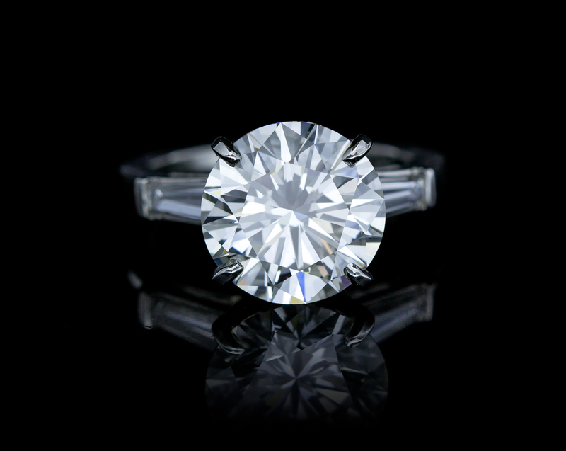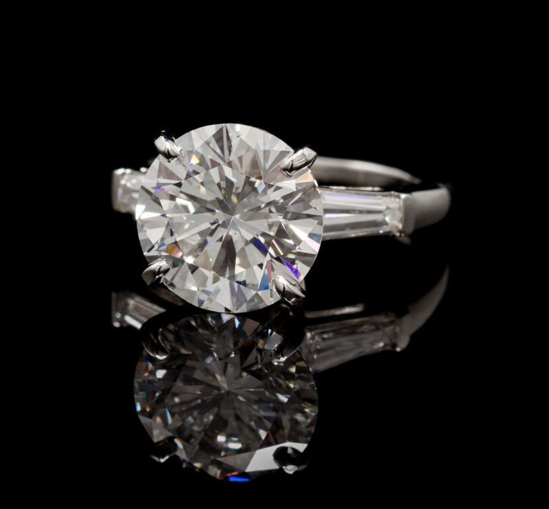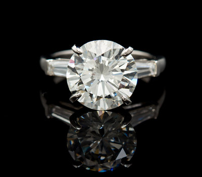 containing one round brilliant cut diamond weighing approximately 6.59 carats and two tapered baguette cut diamonds weighing approximately 0.58 carat total.Stamp: PLAT. Accompanied by a Gemological Institute of America diamond grading certificate number 2165091202, dated April 24, 2014, stating Color: J, Clarity: SI1, Cut: Excellent, Polish: Very Good, Symmetry: Excellent, Fluorescence: Faint.NOTE: The girdle of this diamond has been laser inscribed with a maker's mark and the number 70543.