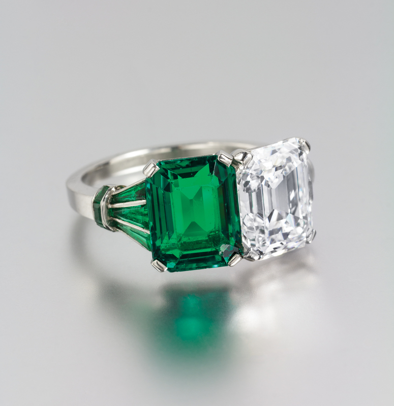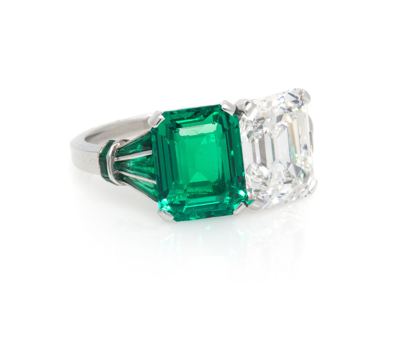 containing one octagonal step cut emerald measuring approximately 10.85 x 8.50 x 5.80 mm, one antique octagonal step cut diamond weighing approximately 4.27 carats, six tapered and straight baguette cut emeralds and seven tapered and straight baguette cut diamonds weighing approximately 0.48 carat total, within an intricately constructed openwork setting.Stamp: 10%IRID PLAT.Accompanied by an American Gemological Laboratories emerald identification and origin certificate number CS 62417, dated July 23, 2014, stating Mineral Type: Natural Beryl, Variety: Emerald, Origin: Classic Colombia, Clarity Enhancement: Insignificant, Type: Traditional.Accompanied by a Gemological Institute of America diamond grading certificate number 1166454381, dated August 1, 2014, stating Weight: 4.27 carats, Color: F, Clarity: VS2, Table: 61.00%, Depth: 57.60%, Polish: Very Good, Symmetry: Good, Fluorescence: None.