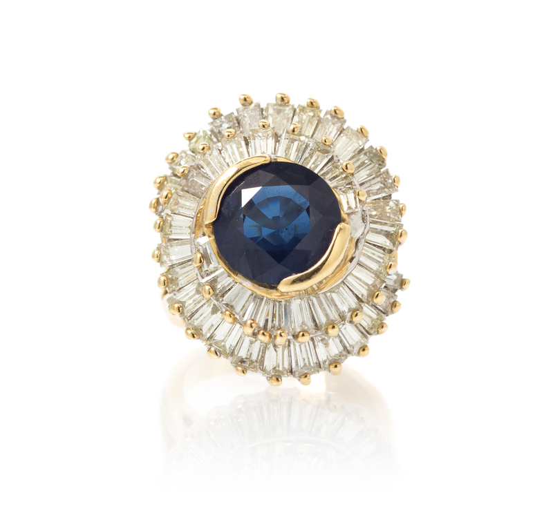 ballerina style ring containing one round mixed cut sapphire weighing approximately 3.75 carats and numerous baguette cut diamonds in a swirl design weighing approximately 1.80 carats total.