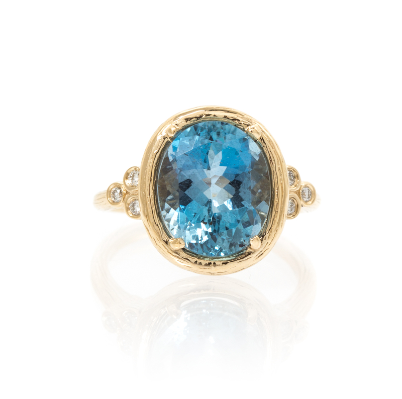 containing one oval mixed cut aquamarine weighing approximately 4.63 carats and six round brilliant cut diamonds weighing approximately 0.09 carat total.Stamp: 14K R.