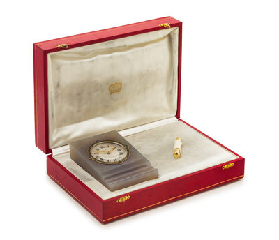 consisting of a wedge form carved translucent grey agate base with grooved pen rest inset with a circular clock, the two section silvered dial with central guilloche sunburst pattern and outer matte finish signed Cartier Made in France, Roman numerals, gold cathedral hands, the bezel accented with black enamel banding and four round cabochon cut sapphires at the compass points, the desk clock measuring approximately 11.40 x 7.30 x 2.86 cm in its entirety, together with a collapsible 18 karat yellow gold mechanical pencil signed Cartier Paris.Accompanied by the original red case signed Cartier with fitted compartments for the clock and pencil.