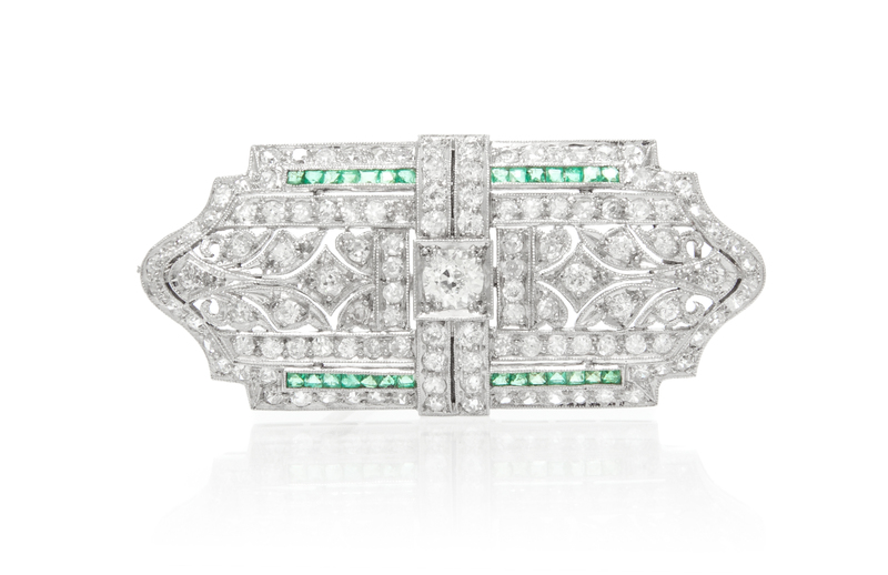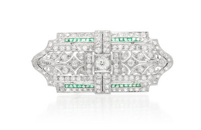 An Art Deco Platinum, Diamond and Emerald Brooch,