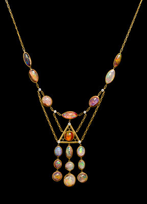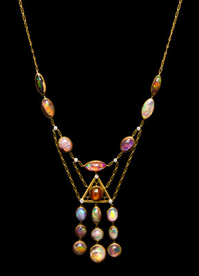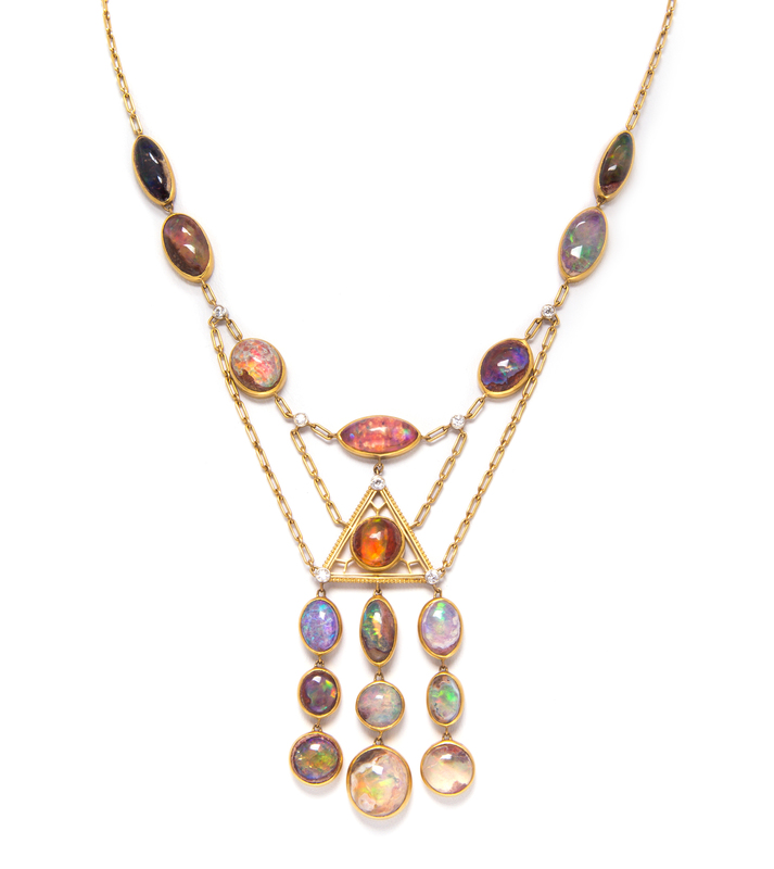 consisting of 17 oval and navette shape cabochon cut bezel set boulder and fire opals of nearly colorless to orange body color, exhibiting strong play-of-color and measuring from approximately 12.85 x 5.45 mm to 11.60 x 11.00 mm, the opals set surrounding and within an intricately textured open wirework center in an equilateral triangle shape, the center section supporting a three row tassel of opals, the necklace accented throughout with seven old European cut diamonds in platinum topped gold bezels weighing approximately 0.25 carat total.Stamp: TIFFANY & Co.Provenance Note:The beginning of the 20th Century was certainly one of the most compelling periods in the history of Tiffany & Company. With Louis Comfort Tiffany as design director, a colorful and naturalistic new aesthetic was brought to the fore. The present necklace makes excellent use of numerous cabochon cut opals, a perennial favorite of Tiffany's, their bold and ever-changing palette of color sharply reminiscent of his famed favrile glass.