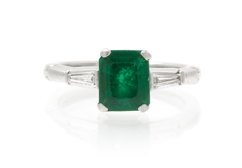 containing one octagonal step cut emerald weighing approximately 1.30 carats and two tapered baguette cut diamonds weighing approximately 0.34 carat total, platinum hinged shank.