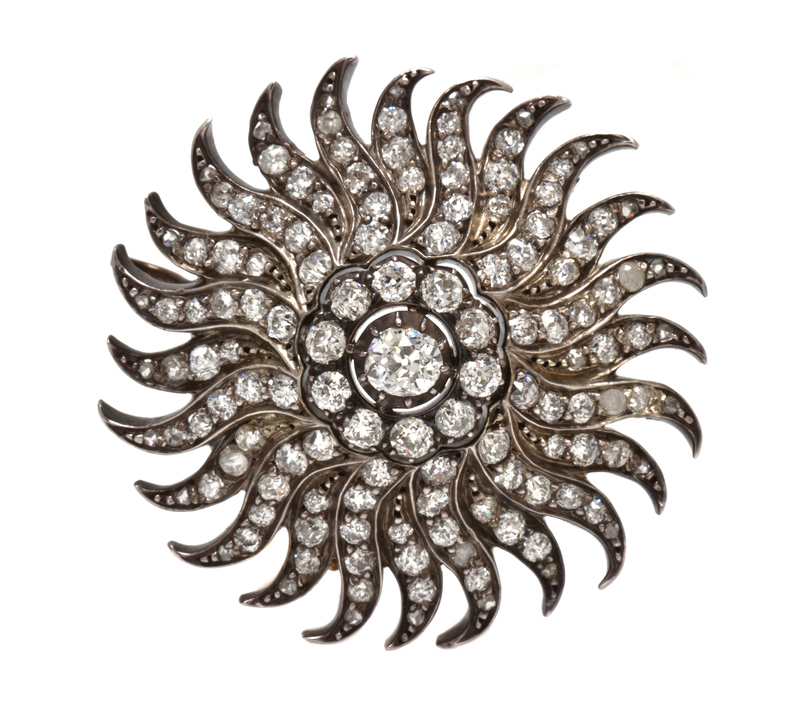 in a spiraled motif comprised of overlapping curved "rays," containing numerous old mine and rose cut diamonds weighing approximately 4.50 carats total.
