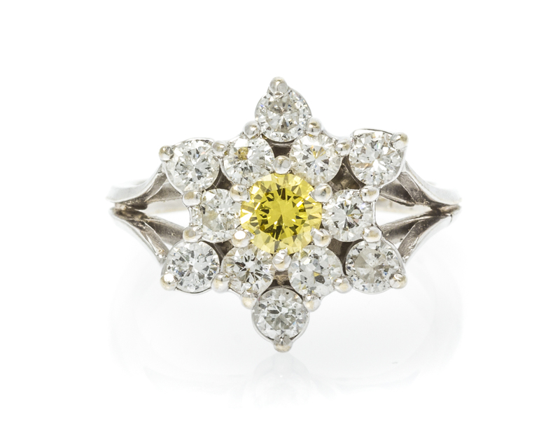 An 18 Karat White Gold, Yellow and White Cluster Diamond Ring,