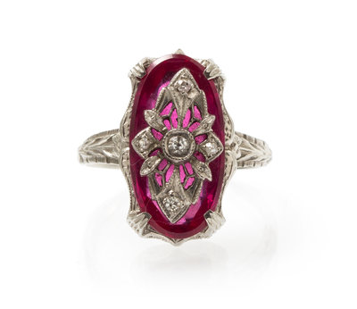 consisting of a hand carved filigree design containing five single cut diamonds weighing approximately 0.04 carat total surmounted on a red glass plaque on an engraved ring base.Stamp: 18K.