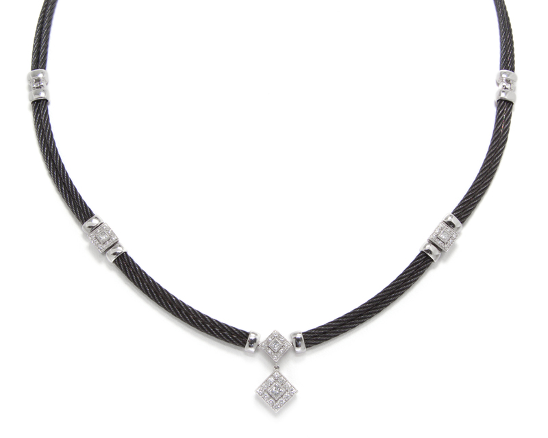 consisting of a double row of black PVD coated stainless steel coated wire in eight sections with 18 karat white gold endcaps and containing four princess cut and 36 round brilliant cut diamonds weighing approximately 0.45 carat total.Stamp: CHARRIOL 750 STEEL.