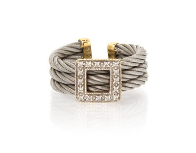 consisting of a stainless steel cable wire necklace suspending an articulated pendant, together with a three row steel wire cable ring with yellow gold and diamond accents. Necklace Stamp: (maker's mark for Charriol).Ring Stamp: CHARRIOL Au750.