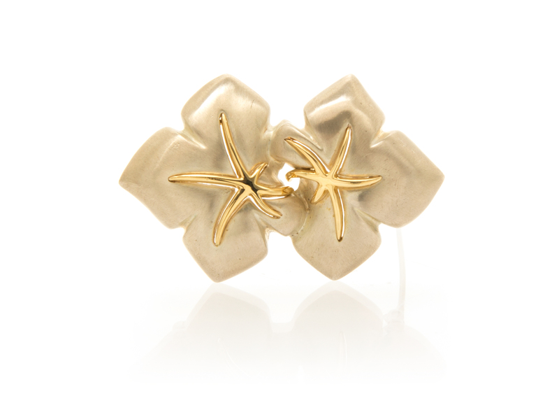 in a stylized double leaf motif, the satin finished silver base surmounted with polished gold veining.Stamp: 1991 TIFFANY & CO. 925 750.