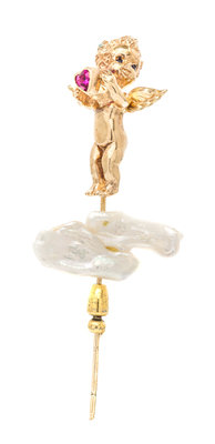 consisting of a sculpted gold cherub accented with two round mixed cut sapphire eyes and holding a heart shape synthetic ruby, together with a baroque pearl terminal.Hand inscribed: 14K Ruser.