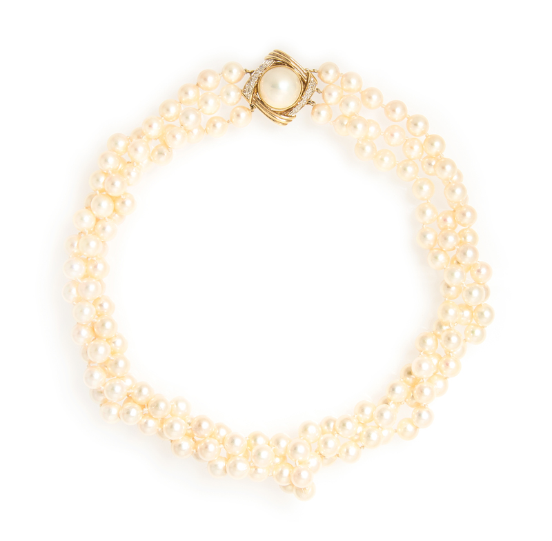 A 14 Karat Yellow Gold, Diamond, Mabe Pearl and Cultured Pearl Triple Strand Necklace,