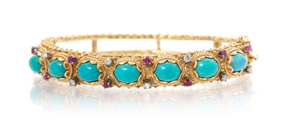 A 14 Karat Yellow Gold, Turquoise, Diamond and Ruby Bangle Bracelet,