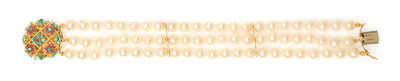 consisting of three strands of pearls measuring approximately 7.05-7.40 mm in diameter strung knotted with two gold spacers and a openwork floral motif clasp containing numerous round cabochon cut turquoise and round mixed cut rubies.Stamp: 18K ITALY.