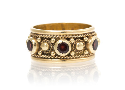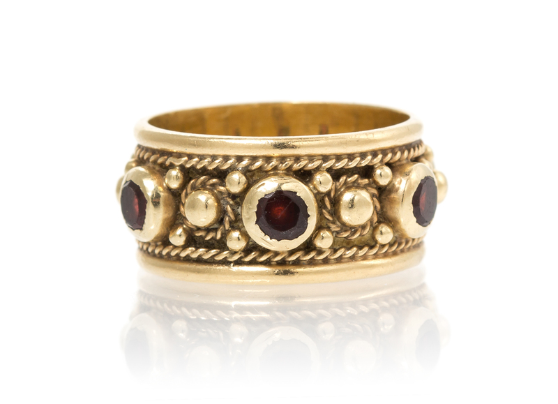 containing six round mixed cut garnets with twisted wire and granulation accents.Stamp: 14K.