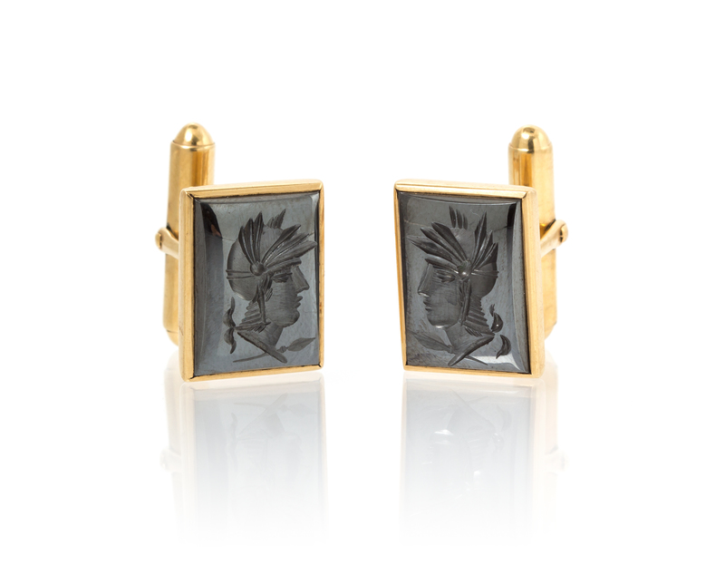 A Pair of 14 Karat Yellow Gold and Hematite Intaglio Cufflinks,