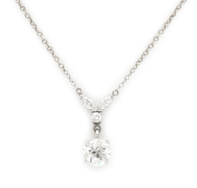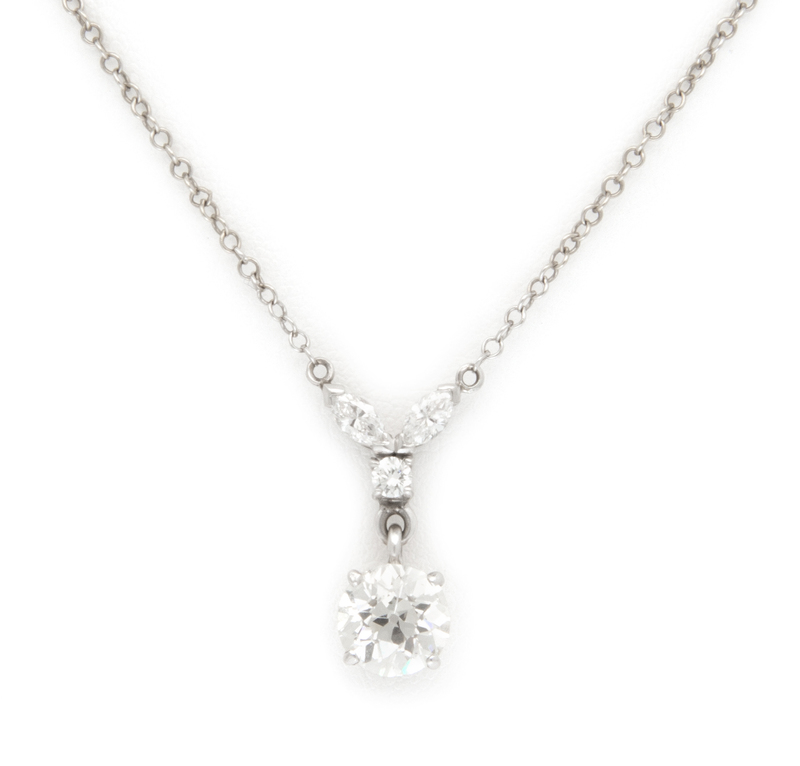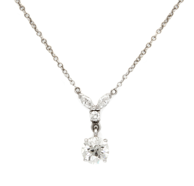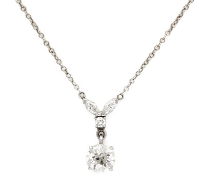 containing one old European cut diamond weighing approximately 1.56 carats total, two marquise cut diamonds weighing approximately 0.20 carat total and one round brilliant cut diamond weighing approximately 0.06 carat total, on a white gold filled cable chain.