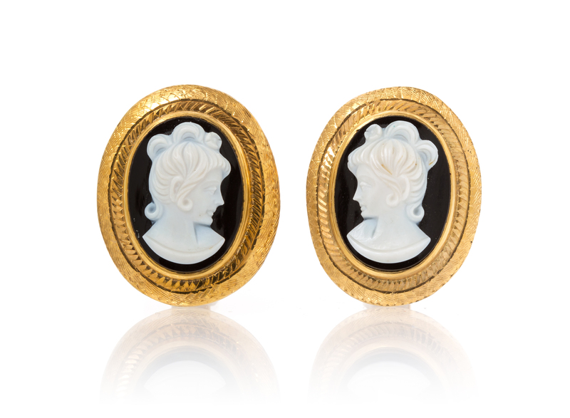 A Pair of 14 Karat Yellow Gold and Onyx Cameo Cufflinks,