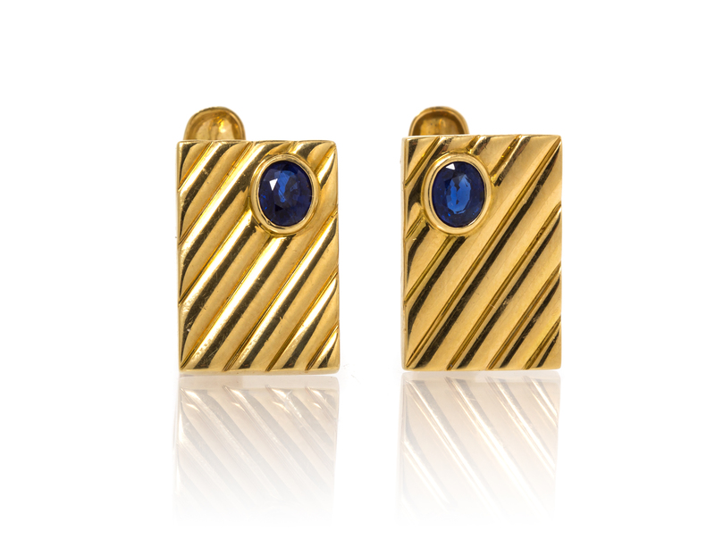 containing two oval mixed cut sapphires weighing approximately 1.20 carats total against a rippled rectangular background, with hinged backs.Stamp: 18K.