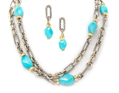 consisting of a necklace and matching earrings containing nine faceted turquoise beads flanked by yellow gold rondelles on a silver figaro chain.Stamp: D.Y. 750 925 (makers mark for David Yurman).