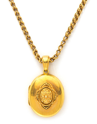 consisting of an oval locket with a central panel of applied granulation design and glazed compartments, suspended from a fancy link chain.