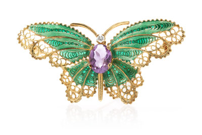 A 14 Karat Yellow Gold, Amethyst, Diamond and Enamel Butterfly Brooch,