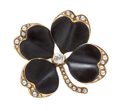 containing one old European cut diamond weighing approximately 0.18 carat and numerous graduated round seed pearls with black enamel in four clover petals.Stamp: 14K.