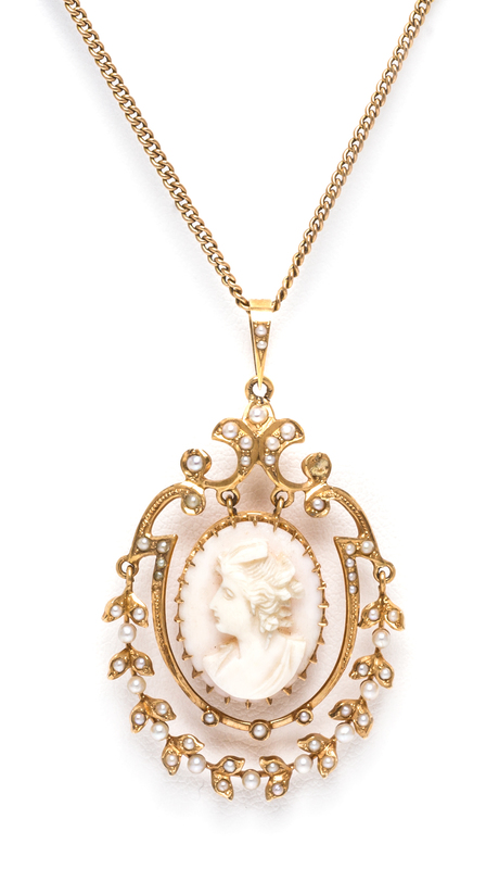 containing a central pale pink and white coral cameo depicting a female profile within a multi prong setting within a foliate motif surround accented with numerous seed pearls, suspended from a 10 karat yellow gold twisted cable link chain.