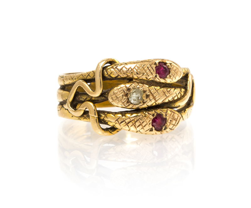 A Yellow Gold, Ruby and Diamond Snake Ring,