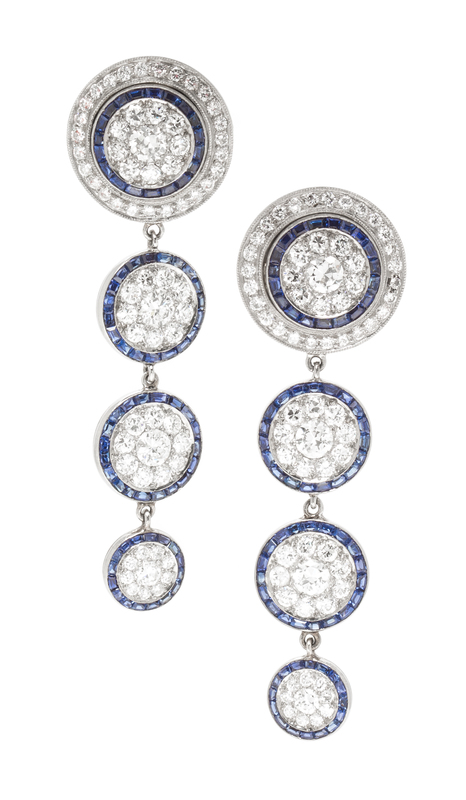 each consisting of four graduated circular links in a dangling design, the earclips containing six old European cut diamonds weighing approximately 1.80 carats total, 120 old European cut and round brilliant cut diamonds weighing approximately 4.00 carats total and numerous calibre step cut sapphires, 14 karat white gold clip backs, converted from a dress set.