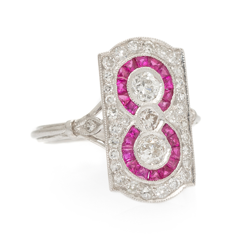 in an Art Deco style, containing 22 French cut rubies weighing approximately 1.30 carat total and numerous old mine and single cut diamonds weighing approximately 0.97 carat total.
