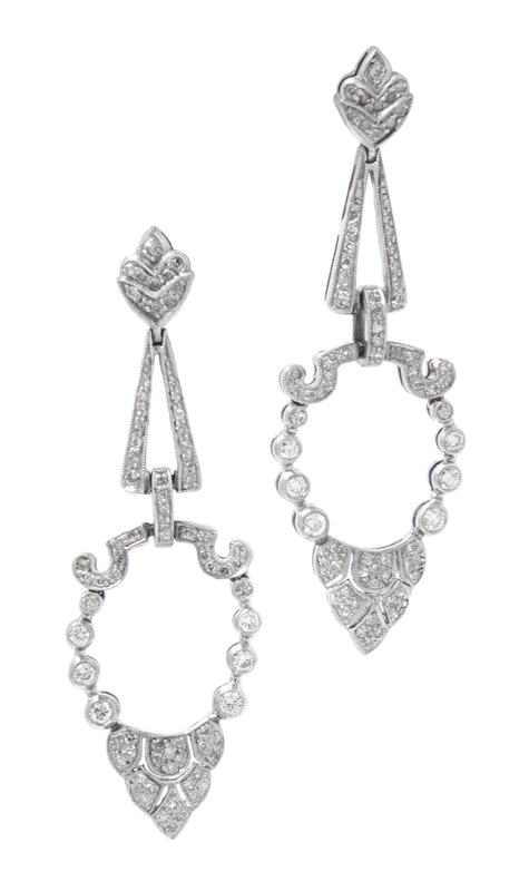 containing numerous round brilliant and single cut diamonds weighing approximately 0.96 carat total with millegrain edging, 14 karat white gold earring backs.