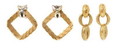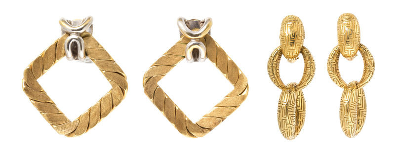 consisting of a pair of 18 karat textured yellow and polished white gold earclips in an open diamond shape, together with a pair of yellow gold multi hoop drop earclips with a Greek key texture.