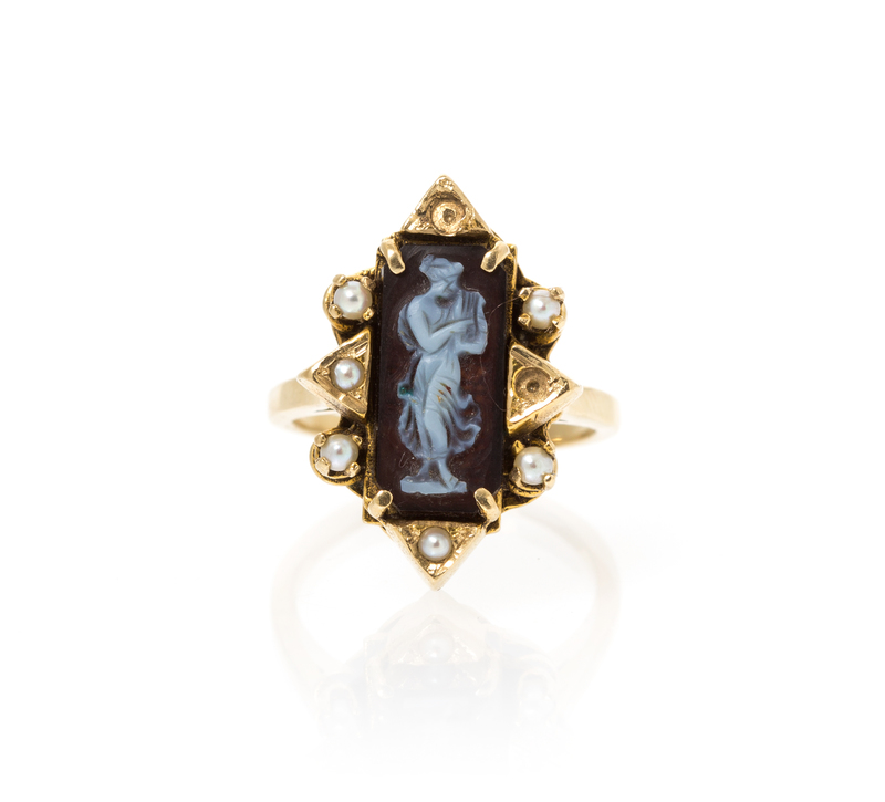 containing one carved onyx cameo depicting a Classical woman playing the harp and six round seed pearls.