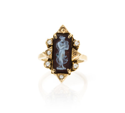 A Yellow Gold, Sardonyx Cameo and Seed Pearl Ring,