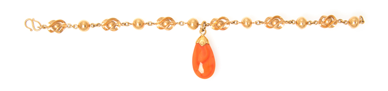 fancy link bracelet containing one drop shape carved piece of coral.