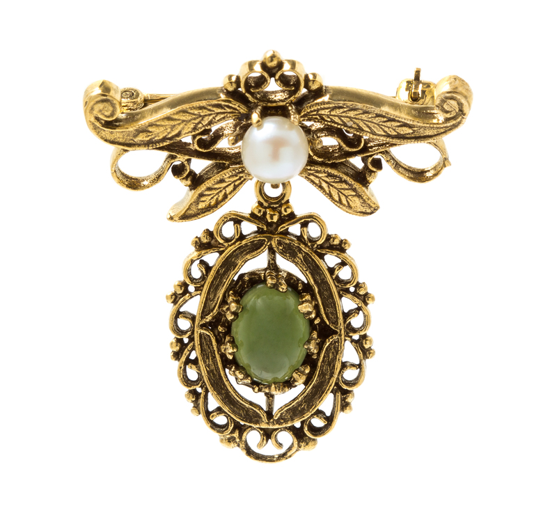 A 14 Karat Yellow Gold, Nephrite Jade and Cultured Pearl Brooch,