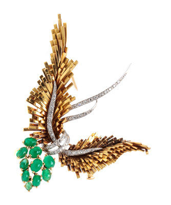 A Yellow Gold, Platinum, Emerald and Diamond Brooch,