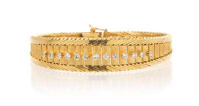 in a brushed texture and herringbone motif finish with clasp and safety, containing 13 round brilliant cut diamonds weighing approximately 0.75 carat total.Stamp: 750 (Italian maker's mark 7VR) ITALY.