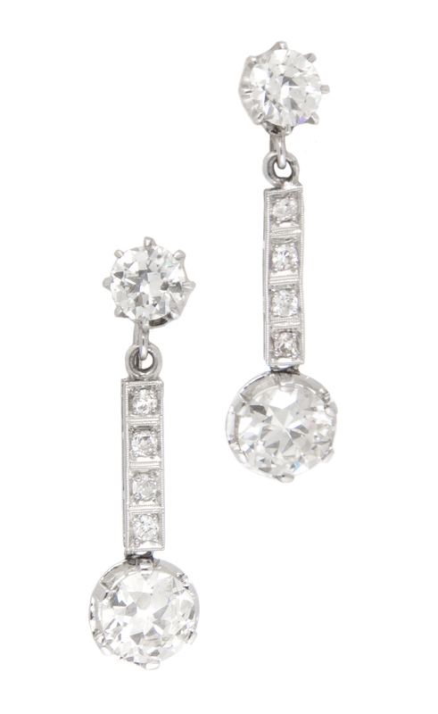 containing two old European cut diamonds weighing approximately 2.25 carats total, two transitional brilliant cut diamonds weighing approximately 1.12 carats total and eight round single cut diamonds weighing approximately 0.12 carat total, 14 karat white gold earring clip backs.